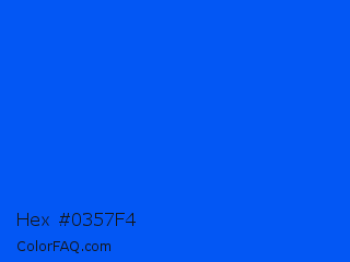 Hex #0357f4 Color is a normal blue color and the nearest color is Blue Ribbon #0066ff. Hex code #0357f4 and RGB value is rgb(3,87,244). In RGB color space, this color is composed of 1% red, 34% green, 96% blue, In CMYK color space, this color is composed of 99% cyan, 64% magenta, 0% yellow , 4% black , In HSL color space, this color has a hue angle of 219° , 98% saturation and 48% lightness.