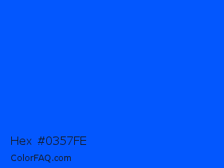 Hex #0357fe Color is a normal blue color and the nearest color is Blue Ribbon #0066ff. Hex code #0357fe and RGB value is rgb(3,87,254). In RGB color space, this color is composed of 1% red, 34% green, 100% blue, In CMYK color space, this color is composed of 99% cyan, 66% magenta, 0% yellow , 0% black , In HSL color space, this color has a hue angle of 220° , 99% saturation and 50% lightness.