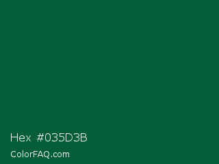 Hex #035d3b Color is a very dark green color and the nearest color is Sacramento State Green #00563f. Hex code #035d3b and RGB value is rgb(3,93,59). In RGB color space, this color is composed of 1% red, 36% green, 23% blue, In CMYK color space, this color is composed of 97% cyan, 0% magenta, 37% yellow , 64% black , In HSL color space, this color has a hue angle of 157° , 94% saturation and 19% lightness.