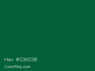 Hex #036038 Color is a very dark green color and the nearest color is Cadmium Green #006b3c. Hex code #036038 and RGB value is rgb(3,96,56). In RGB color space, this color is composed of 1% red, 38% green, 22% blue, In CMYK color space, this color is composed of 97% cyan, 0% magenta, 42% yellow , 62% black , In HSL color space, this color has a hue angle of 154° , 94% saturation and 19% lightness.