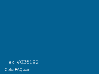 Hex #036192 Color is a dark blue color and the nearest color is Bahama Blue #026395. Hex code #036192 and RGB value is rgb(3,97,146). In RGB color space, this color is composed of 1% red, 38% green, 57% blue, In CMYK color space, this color is composed of 98% cyan, 34% magenta, 0% yellow , 43% black , In HSL color space, this color has a hue angle of 201° , 96% saturation and 29% lightness.
