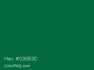 Hex #036b3d Color is a very dark green color and the nearest color is Cadmium Green #006b3c. Hex code #036b3d and RGB value is rgb(3,107,61). In RGB color space, this color is composed of 1% red, 42% green, 24% blue, In CMYK color space, this color is composed of 97% cyan, 0% magenta, 43% yellow , 58% black , In HSL color space, this color has a hue angle of 153° , 95% saturation and 22% lightness.