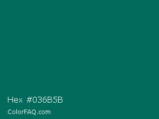 Hex #036b5b Color is a very dark cyan color and the nearest color is Watercourse #056f57. Hex code #036b5b and RGB value is rgb(3,107,91). In RGB color space, this color is composed of 1% red, 42% green, 36% blue, In CMYK color space, this color is composed of 97% cyan, 0% magenta, 15% yellow , 58% black , In HSL color space, this color has a hue angle of 171° , 95% saturation and 22% lightness.