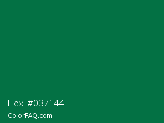 Hex #037144 Color is a dark green color and the nearest color is Dartmouth Green #00703c. Hex code #037144 and RGB value is rgb(3,113,68). In RGB color space, this color is composed of 1% red, 44% green, 27% blue, In CMYK color space, this color is composed of 97% cyan, 0% magenta, 40% yellow , 56% black , In HSL color space, this color has a hue angle of 155° , 95% saturation and 23% lightness.