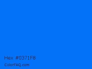 Hex #0371f8 Color is a normal blue color and the nearest color is Brandeis Blue #0070ff. Hex code #0371f8 and RGB value is rgb(3,113,248). In RGB color space, this color is composed of 1% red, 44% green, 97% blue, In CMYK color space, this color is composed of 99% cyan, 54% magenta, 0% yellow , 3% black , In HSL color space, this color has a hue angle of 213° , 98% saturation and 49% lightness.