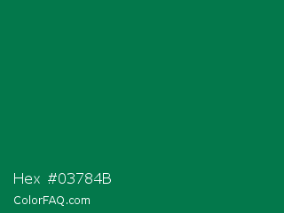Hex #03784b Color is a dark green color and the nearest color is Salem #097f4b. Hex code #03784b and RGB value is rgb(3,120,75). In RGB color space, this color is composed of 1% red, 47% green, 29% blue, In CMYK color space, this color is composed of 98% cyan, 0% magenta, 38% yellow , 53% black , In HSL color space, this color has a hue angle of 157° , 95% saturation and 24% lightness.