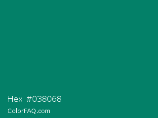 Hex #038068 Color is a dark cyan color and the nearest color is Generic Viridian #007f66. Hex code #038068 and RGB value is rgb(3,128,104). In RGB color space, this color is composed of 1% red, 50% green, 41% blue, In CMYK color space, this color is composed of 98% cyan, 0% magenta, 19% yellow , 50% black , In HSL color space, this color has a hue angle of 168° , 95% saturation and 26% lightness.