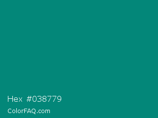 Hex #038779 Color is a dark cyan color and the nearest color is Teal Green #00827f. Hex code #038779 and RGB value is rgb(3,135,121). In RGB color space, this color is composed of 1% red, 53% green, 47% blue, In CMYK color space, this color is composed of 98% cyan, 0% magenta, 10% yellow , 47% black , In HSL color space, this color has a hue angle of 174° , 96% saturation and 27% lightness.