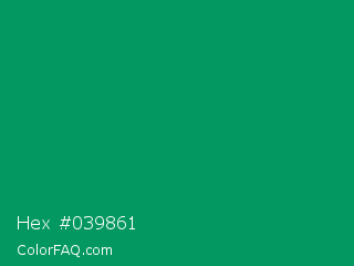 Hex #039861 Color is a dark green color and the nearest color is Green Cyan #009966. Hex code #039861 and RGB value is rgb(3,152,97). In RGB color space, this color is composed of 1% red, 60% green, 38% blue, In CMYK color space, this color is composed of 98% cyan, 0% magenta, 36% yellow , 40% black , In HSL color space, this color has a hue angle of 158° , 96% saturation and 30% lightness.