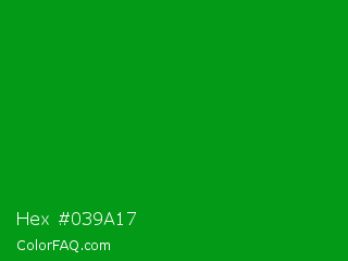 Hex #039a17 Color is a normal green color and the nearest color is Islamic Green #009000. Hex code #039a17 and RGB value is rgb(3,154,23). In RGB color space, this color is composed of 1% red, 60% green, 9% blue, In CMYK color space, this color is composed of 98% cyan, 0% magenta, 85% yellow , 40% black , In HSL color space, this color has a hue angle of 128° , 96% saturation and 31% lightness.