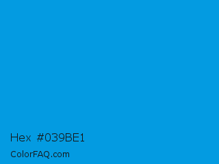Hex #039be1 Color is a normal blue color and the nearest color is Cerulean #02a4d3. Hex code #039be1 and RGB value is rgb(3,155,225). In RGB color space, this color is composed of 1% red, 61% green, 88% blue, In CMYK color space, this color is composed of 99% cyan, 31% magenta, 0% yellow , 12% black , In HSL color space, this color has a hue angle of 199° , 97% saturation and 45% lightness.