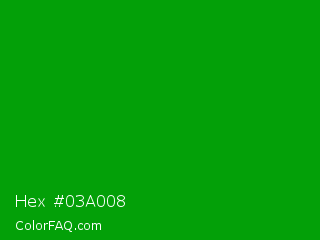 Hex #03a008 Color is a normal green color and the nearest color is Islamic Green #009000. Hex code #03a008 and RGB value is rgb(3,160,8). In RGB color space, this color is composed of 1% red, 63% green, 3% blue, In CMYK color space, this color is composed of 98% cyan, 0% magenta, 95% yellow , 37% black , In HSL color space, this color has a hue angle of 122° , 96% saturation and 32% lightness.