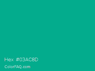 Hex #03ac8d Color is a normal cyan color and the nearest color is Persian Green #00a693. Hex code #03ac8d and RGB value is rgb(3,172,141). In RGB color space, this color is composed of 1% red, 67% green, 55% blue, In CMYK color space, this color is composed of 98% cyan, 0% magenta, 18% yellow , 33% black , In HSL color space, this color has a hue angle of 169° , 97% saturation and 34% lightness.