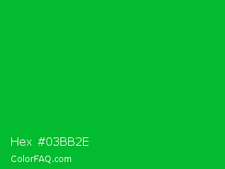 Hex #03bb2e Color is a normal green color and the nearest color is Dark Pastel Green #03c03c. Hex code #03bb2e and RGB value is rgb(3,187,46). In RGB color space, this color is composed of 1% red, 73% green, 18% blue, In CMYK color space, this color is composed of 98% cyan, 0% magenta, 75% yellow , 27% black , In HSL color space, this color has a hue angle of 134° , 97% saturation and 37% lightness.