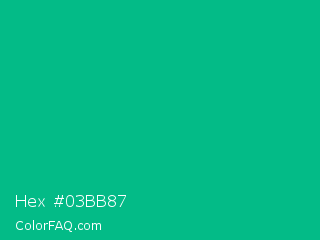 Hex #03bb87 Color is a normal green color and the nearest color is Persian Green #00a693. Hex code #03bb87 and RGB value is rgb(3,187,135). In RGB color space, this color is composed of 1% red, 73% green, 53% blue, In CMYK color space, this color is composed of 98% cyan, 0% magenta, 28% yellow , 27% black , In HSL color space, this color has a hue angle of 163° , 97% saturation and 37% lightness.