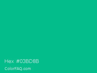 Hex #03bd8b Color is a normal cyan color and the nearest color is Caribbean Green #00cc99. Hex code #03bd8b and RGB value is rgb(3,189,139). In RGB color space, this color is composed of 1% red, 74% green, 55% blue, In CMYK color space, this color is composed of 98% cyan, 0% magenta, 26% yellow , 26% black , In HSL color space, this color has a hue angle of 164° , 97% saturation and 38% lightness.