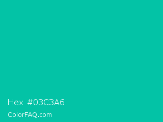 Hex #03c3a6 Color is a normal cyan color and the nearest color is Amazonite #00c4b0. Hex code #03c3a6 and RGB value is rgb(3,195,166). In RGB color space, this color is composed of 1% red, 76% green, 65% blue, In CMYK color space, this color is composed of 98% cyan, 0% magenta, 15% yellow , 24% black , In HSL color space, this color has a hue angle of 171° , 97% saturation and 39% lightness.