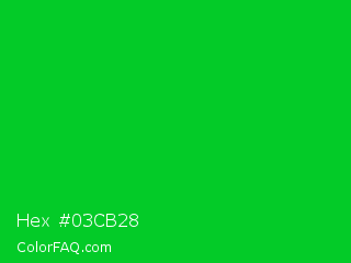 Hex #03cb28 Color is a normal green color and the nearest color is Vivid Malachite #00cc33. Hex code #03cb28 and RGB value is rgb(3,203,40). In RGB color space, this color is composed of 1% red, 80% green, 16% blue, In CMYK color space, this color is composed of 99% cyan, 0% magenta, 80% yellow , 20% black , In HSL color space, this color has a hue angle of 131° , 97% saturation and 40% lightness.