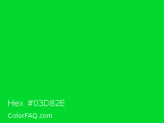 Hex #03d82e Color is a normal green color and the nearest color is Vivid Malachite #00cc33. Hex code #03d82e and RGB value is rgb(3,216,46). In RGB color space, this color is composed of 1% red, 85% green, 18% blue, In CMYK color space, this color is composed of 99% cyan, 0% magenta, 79% yellow , 15% black , In HSL color space, this color has a hue angle of 132° , 97% saturation and 43% lightness.