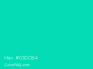 Hex #03dcb4 Color is a normal cyan color and the nearest color is Amazonite #00c4b0. Hex code #03dcb4 and RGB value is rgb(3,220,180). In RGB color space, this color is composed of 1% red, 86% green, 71% blue, In CMYK color space, this color is composed of 99% cyan, 0% magenta, 18% yellow , 14% black , In HSL color space, this color has a hue angle of 169° , 97% saturation and 44% lightness.