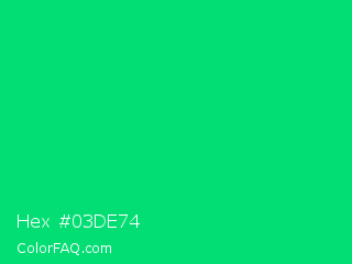 Hex #03de74 Color is a normal green color and the nearest color is Spring Green #00ff7f. Hex code #03de74 and RGB value is rgb(3,222,116). In RGB color space, this color is composed of 1% red, 87% green, 45% blue, In CMYK color space, this color is composed of 99% cyan, 0% magenta, 48% yellow , 13% black , In HSL color space, this color has a hue angle of 151° , 97% saturation and 44% lightness.