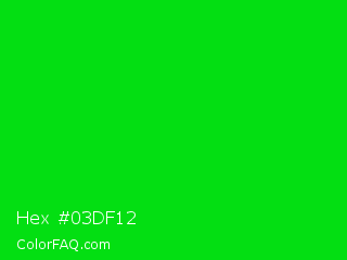 Hex #03df12 Color is a normal green color and the nearest color is Green #00ff00. Hex code #03df12 and RGB value is rgb(3,223,18). In RGB color space, this color is composed of 1% red, 87% green, 7% blue, In CMYK color space, this color is composed of 99% cyan, 0% magenta, 92% yellow , 13% black , In HSL color space, this color has a hue angle of 124° , 97% saturation and 44% lightness.