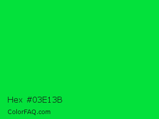 Hex #03e13b Color is a normal green color and the nearest color is Vivid Malachite #00cc33. Hex code #03e13b and RGB value is rgb(3,225,59). In RGB color space, this color is composed of 1% red, 88% green, 23% blue, In CMYK color space, this color is composed of 99% cyan, 0% magenta, 74% yellow , 12% black , In HSL color space, this color has a hue angle of 135° , 97% saturation and 45% lightness.