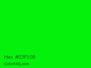 Hex #03f10b Color is a normal green color and the nearest color is Green #00ff00. Hex code #03f10b and RGB value is rgb(3,241,11). In RGB color space, this color is composed of 1% red, 95% green, 4% blue, In CMYK color space, this color is composed of 99% cyan, 0% magenta, 95% yellow , 5% black , In HSL color space, this color has a hue angle of 122° , 98% saturation and 48% lightness.