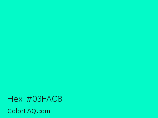 Hex #03fac8 Color is a normal cyan color and the nearest color is Bright Turquoise #08e8de. Hex code #03fac8 and RGB value is rgb(3,250,200). In RGB color space, this color is composed of 1% red, 98% green, 78% blue, In CMYK color space, this color is composed of 99% cyan, 0% magenta, 20% yellow , 2% black , In HSL color space, this color has a hue angle of 168° , 98% saturation and 50% lightness.