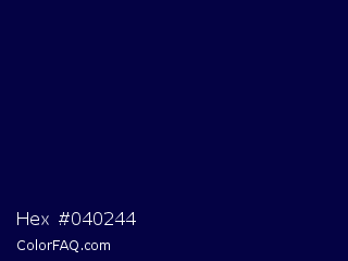 Hex #040244 Color is a very dark indigo color and the nearest color is Stratos #000741. Hex code #040244 and RGB value is rgb(4,2,68). In RGB color space, this color is composed of 2% red, 1% green, 27% blue, In CMYK color space, this color is composed of 94% cyan, 97% magenta, 0% yellow , 73% black , In HSL color space, this color has a hue angle of 242° , 94% saturation and 14% lightness.