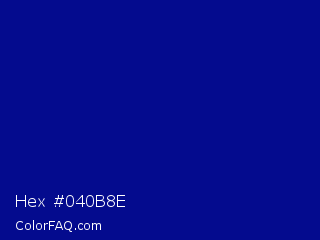 Hex #040b8e Color is a dark blue color and the nearest color is Phthalo Blue #000f89. Hex code #040b8e and RGB value is rgb(4,11,142). In RGB color space, this color is composed of 2% red, 4% green, 56% blue, In CMYK color space, this color is composed of 97% cyan, 92% magenta, 0% yellow , 44% black , In HSL color space, this color has a hue angle of 237° , 95% saturation and 29% lightness.