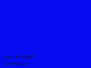 Hex #040bef Color is a normal blue color and the nearest color is Blue #0000ff. Hex code #040bef and RGB value is rgb(4,11,239). In RGB color space, this color is composed of 2% red, 4% green, 94% blue, In CMYK color space, this color is composed of 98% cyan, 95% magenta, 0% yellow , 6% black , In HSL color space, this color has a hue angle of 238° , 97% saturation and 48% lightness.