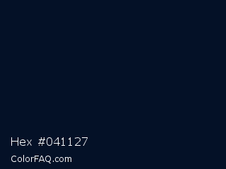 Hex #041127 Color is a almost black blue color and the nearest color is Black Pearl #041322. Hex code #041127 and RGB value is rgb(4,17,39). In RGB color space, this color is composed of 2% red, 7% green, 15% blue, In CMYK color space, this color is composed of 90% cyan, 56% magenta, 0% yellow , 85% black , In HSL color space, this color has a hue angle of 218° , 81% saturation and 8% lightness.