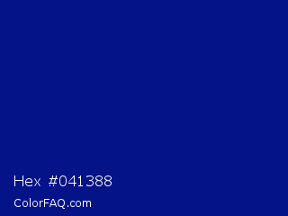 Hex #041388 Color is a dark blue color and the nearest color is Phthalo Blue #000f89. Hex code #041388 and RGB value is rgb(4,19,136). In RGB color space, this color is composed of 2% red, 7% green, 53% blue, In CMYK color space, this color is composed of 97% cyan, 86% magenta, 0% yellow , 47% black , In HSL color space, this color has a hue angle of 233° , 94% saturation and 27% lightness.