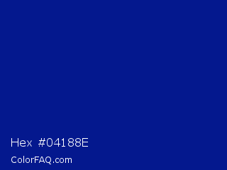 Hex #04188e Color is a dark blue color and the nearest color is Indigo Dye #091f92. Hex code #04188e and RGB value is rgb(4,24,142). In RGB color space, this color is composed of 2% red, 9% green, 56% blue, In CMYK color space, this color is composed of 97% cyan, 83% magenta, 0% yellow , 44% black , In HSL color space, this color has a hue angle of 231° , 95% saturation and 29% lightness.