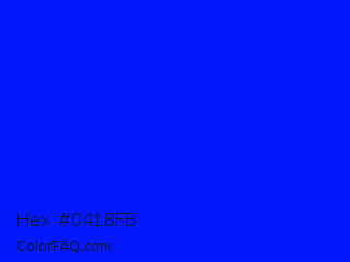 Hex #0418fb Color is a normal blue color and the nearest color is Blue #0000ff. Hex code #0418fb and RGB value is rgb(4,24,251). In RGB color space, this color is composed of 2% red, 9% green, 98% blue, In CMYK color space, this color is composed of 98% cyan, 90% magenta, 0% yellow , 2% black , In HSL color space, this color has a hue angle of 235° , 97% saturation and 50% lightness.