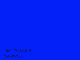 Hex #0420f9 Color is a normal blue color and the nearest color is Bluebonnet #1c1cf0. Hex code #0420f9 and RGB value is rgb(4,32,249). In RGB color space, this color is composed of 2% red, 13% green, 98% blue, In CMYK color space, this color is composed of 98% cyan, 87% magenta, 0% yellow , 2% black , In HSL color space, this color has a hue angle of 233° , 97% saturation and 50% lightness.