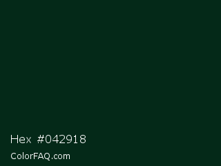 Hex #042918 Color is a almost black green color and the nearest color is English Holly #022d15. Hex code #042918 and RGB value is rgb(4,41,24). In RGB color space, this color is composed of 2% red, 16% green, 9% blue, In CMYK color space, this color is composed of 90% cyan, 0% magenta, 41% yellow , 84% black , In HSL color space, this color has a hue angle of 152° , 82% saturation and 9% lightness.