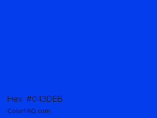 Hex #043deb Color is a normal blue color and the nearest color is Blue RYB #0247fe. Hex code #043deb and RGB value is rgb(4,61,235). In RGB color space, this color is composed of 2% red, 24% green, 92% blue, In CMYK color space, this color is composed of 98% cyan, 74% magenta, 0% yellow , 8% black , In HSL color space, this color has a hue angle of 225° , 97% saturation and 47% lightness.