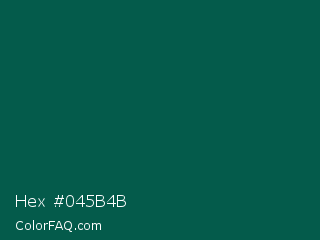 Hex #045b4b Color is a very dark cyan color and the nearest color is Sacramento State Green #00563f. Hex code #045b4b and RGB value is rgb(4,91,75). In RGB color space, this color is composed of 2% red, 36% green, 29% blue, In CMYK color space, this color is composed of 96% cyan, 0% magenta, 18% yellow , 64% black , In HSL color space, this color has a hue angle of 169° , 92% saturation and 19% lightness.