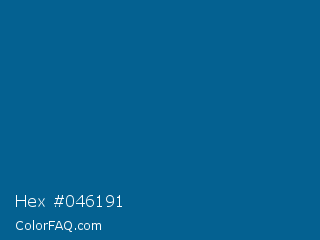 Hex #046191 Color is a dark blue color and the nearest color is Bahama Blue #026395. Hex code #046191 and RGB value is rgb(4,97,145). In RGB color space, this color is composed of 2% red, 38% green, 57% blue, In CMYK color space, this color is composed of 97% cyan, 33% magenta, 0% yellow , 43% black , In HSL color space, this color has a hue angle of 200° , 95% saturation and 29% lightness.