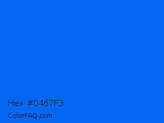 Hex #0467f3 Color is a normal blue color and the nearest color is Blue Ribbon #0066ff. Hex code #0467f3 and RGB value is rgb(4,103,243). In RGB color space, this color is composed of 2% red, 40% green, 95% blue, In CMYK color space, this color is composed of 98% cyan, 58% magenta, 0% yellow , 5% black , In HSL color space, this color has a hue angle of 215° , 97% saturation and 48% lightness.