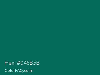 Hex #046b5b Color is a very dark cyan color and the nearest color is Watercourse #056f57. Hex code #046b5b and RGB value is rgb(4,107,91). In RGB color space, this color is composed of 2% red, 42% green, 36% blue, In CMYK color space, this color is composed of 96% cyan, 0% magenta, 15% yellow , 58% black , In HSL color space, this color has a hue angle of 171° , 93% saturation and 22% lightness.