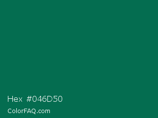 Hex #046d50 Color is a very dark green color and the nearest color is Bottle Green #006a4e. Hex code #046d50 and RGB value is rgb(4,109,80). In RGB color space, this color is composed of 2% red, 43% green, 31% blue, In CMYK color space, this color is composed of 96% cyan, 0% magenta, 27% yellow , 57% black , In HSL color space, this color has a hue angle of 163° , 93% saturation and 22% lightness.