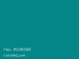 Hex #048588 Color is a dark cyan color and the nearest color is Dark Cyan #008b8b. Hex code #048588 and RGB value is rgb(4,133,136). In RGB color space, this color is composed of 2% red, 52% green, 53% blue, In CMYK color space, this color is composed of 97% cyan, 2% magenta, 0% yellow , 47% black , In HSL color space, this color has a hue angle of 181° , 94% saturation and 27% lightness.