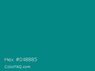 Hex #048885 Color is a dark cyan color and the nearest color is Dark Cyan #008b8b. Hex code #048885 and RGB value is rgb(4,136,133). In RGB color space, this color is composed of 2% red, 53% green, 52% blue, In CMYK color space, this color is composed of 97% cyan, 0% magenta, 2% yellow , 47% black , In HSL color space, this color has a hue angle of 179° , 94% saturation and 27% lightness.