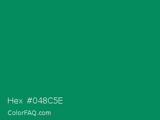 Hex #048c5e Color is a dark green color and the nearest color is Spanish Viridian #007f5c. Hex code #048c5e and RGB value is rgb(4,140,94). In RGB color space, this color is composed of 2% red, 55% green, 37% blue, In CMYK color space, this color is composed of 97% cyan, 0% magenta, 33% yellow , 45% black , In HSL color space, this color has a hue angle of 160° , 94% saturation and 28% lightness.