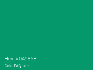 Hex #04986b Color is a normal green color and the nearest color is Green Cyan #009966. Hex code #04986b and RGB value is rgb(4,152,107). In RGB color space, this color is composed of 2% red, 60% green, 42% blue, In CMYK color space, this color is composed of 97% cyan, 0% magenta, 30% yellow , 40% black , In HSL color space, this color has a hue angle of 162° , 95% saturation and 31% lightness.