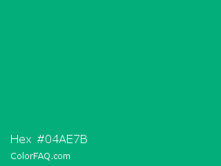 Hex #04ae7b Color is a normal green color and the nearest color is Green Munsell #00a877. Hex code #04ae7b and RGB value is rgb(4,174,123). In RGB color space, this color is composed of 2% red, 68% green, 48% blue, In CMYK color space, this color is composed of 98% cyan, 0% magenta, 29% yellow , 32% black , In HSL color space, this color has a hue angle of 162° , 96% saturation and 35% lightness.