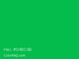 Hex #04bc4b Color is a normal green color and the nearest color is Dark Pastel Green #03c03c. Hex code #04bc4b and RGB value is rgb(4,188,75). In RGB color space, this color is composed of 2% red, 74% green, 29% blue, In CMYK color space, this color is composed of 98% cyan, 0% magenta, 60% yellow , 26% black , In HSL color space, this color has a hue angle of 143° , 96% saturation and 38% lightness.